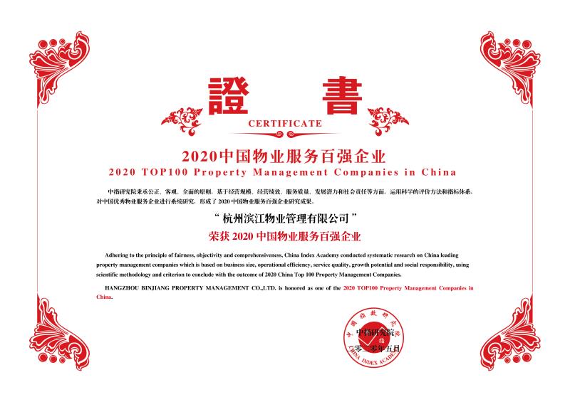 HANGZHOU BINJIANG PROPERTY MANAGEMENT CO.,LTD. is honored as one of the 2020 TOP100 Property Management Companies in China.