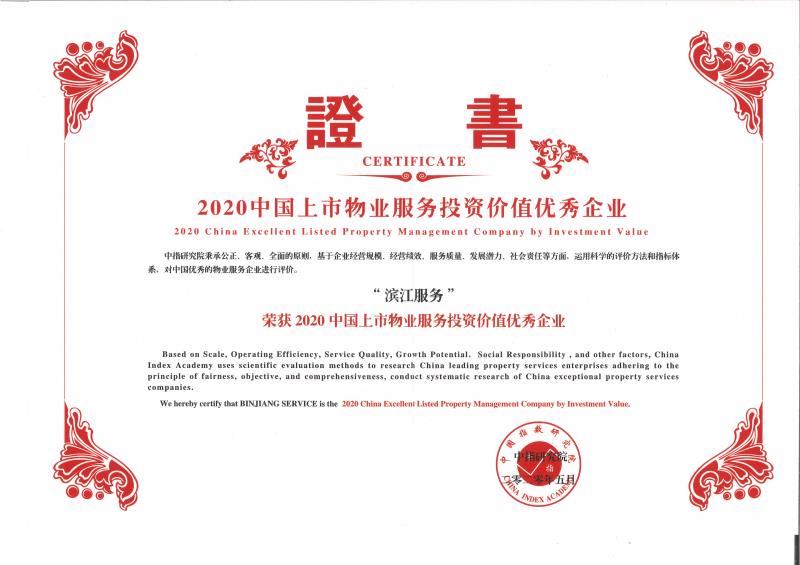BINJIANG SERVICE is the 2020 China Excellent Listed Property Management Company by Investment Value.