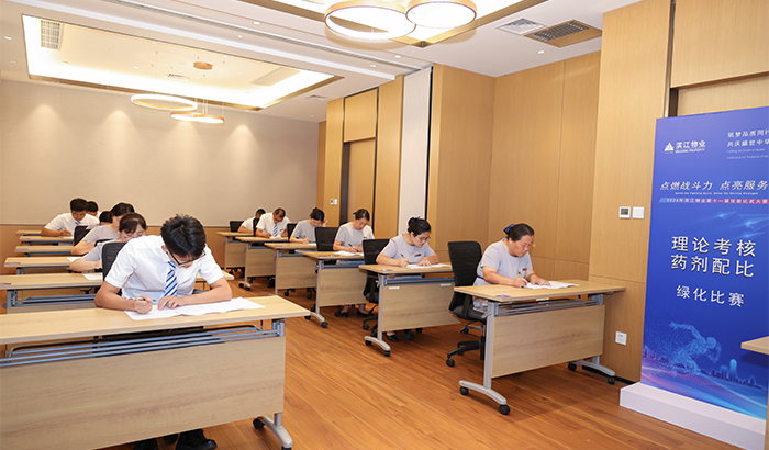 园林绿化美不美,与绿化人的精心养护分不开。走进赛场,还得看绿化人的专业知识和实操技能是否扎实,他们从绿化专业知识测试到药剂配比演练,认真发挥,精准配比,为提升滨江物业园林绿化这张金名片而不懈努力。